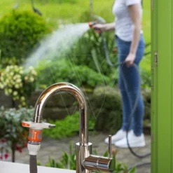 Door de comfortabele hoogte zorgt dat de tuinkraan gemakkelijk in gebruik is. Daarnaast kan de kraan in verschillende flexibele richtingen draaien en kan doormiddel van het reguleerventiel de stoomsnelheid worden geregeld.